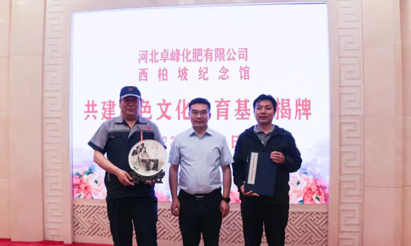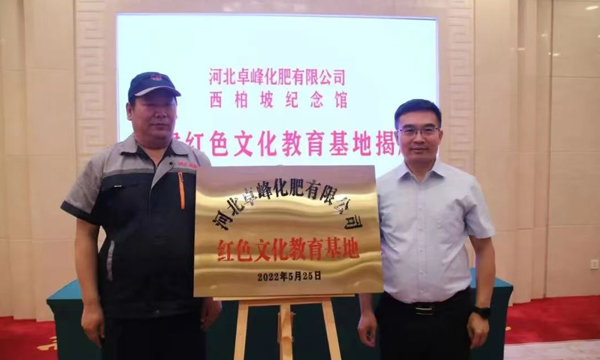 2022年5月25日,河北卓峰化肥有限公司一行人,来到红色革命圣地西柏坡,向西柏坡纪念馆捐赠供园区一年使用的聚谷氨酸复合肥料和微生物菌肥,并与西柏坡纪念馆结成共建单位。西柏坡纪念馆党委书记金立兴与河北卓峰化肥有限公司董事长刘柱森共同出席了共建红色文化教育基地揭牌仪式,并签署了合作协议。